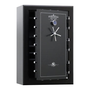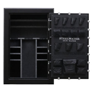 The Steelwater MAX793928 MAX Series Gun Safe is designed for maximum security, holding up to 43 long guns with an average capacity of 35-41 firearms. Built with a 3-gauge steel body, a composite 5 1/8” thick door, and 20 massive 1 ½” solid steel locking bolts, it offers superior protection against prying, drilling, and fire damage.Its EMP-proof digital keypad with an optional X3 biometric lock ensures advanced security and easy access. This safe features 2.5 hours of fire protection at 1875°F, a heat-activated door seal, and a fully upholstered interior with customizable shelving. Additional perks include an LED-lit interior, built-in power outlets with USB ports, and a free door organizer and dehumidifier for added convenience.