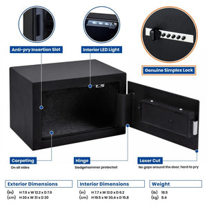 Maximize protection for your valuables with this compactĀ Viking Security Safe VSā20SX smallāsize multiāgun handgun safe. Some call it theĀ Forever Safe. Its reliability starts with theĀ Genuine Simplex pushābutton purely mechanical lockĀ in satin chrome. With aĀ 5 mm steel door, sledgehammerāprotected hinges, aĀ Protective Lock Chamber, laserācut construction and pryāresistant design, this safe is built to resist intrusion. TheĀ stainless steel 40 mm flat deadboltĀ seats deep into theĀ antiāpry insertion slotĀ in the frame. The door opens wide with aĀ 45ādegreeĀ swing for easy access. No electronics, no batteries, no failures ā reliable mechanical security for the long term.