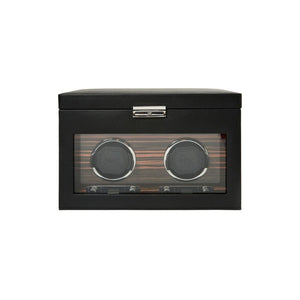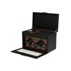 Aged wood dashboards, chrome spoked wheels, leather that is glove soft. The Wolf 457156 Roadster Double Watch Winder with Storage - inspired by the best of British motorcars, Jaguar, Aston Martin, Bristol and the like. Turning your watch perfectly to a precise number of turns, the Roadster double winder with storage’s ebony macassar polished wood, chrome finished hardware and 3-piece watch storage makes the perfect backdrop for your watch.