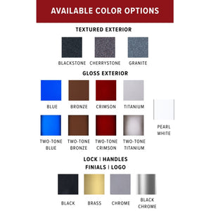 Locks and electronic keypads carry a five-year warranty for labor and parts. The warranty does not cover forgotten or lost combinations, lost keys, dead or weak batteries, or improper opening procedures. Lights and electrical components carry a one-year warranty. Paint or powder coat finish and interior are warranted for one year based on proper care and environment.